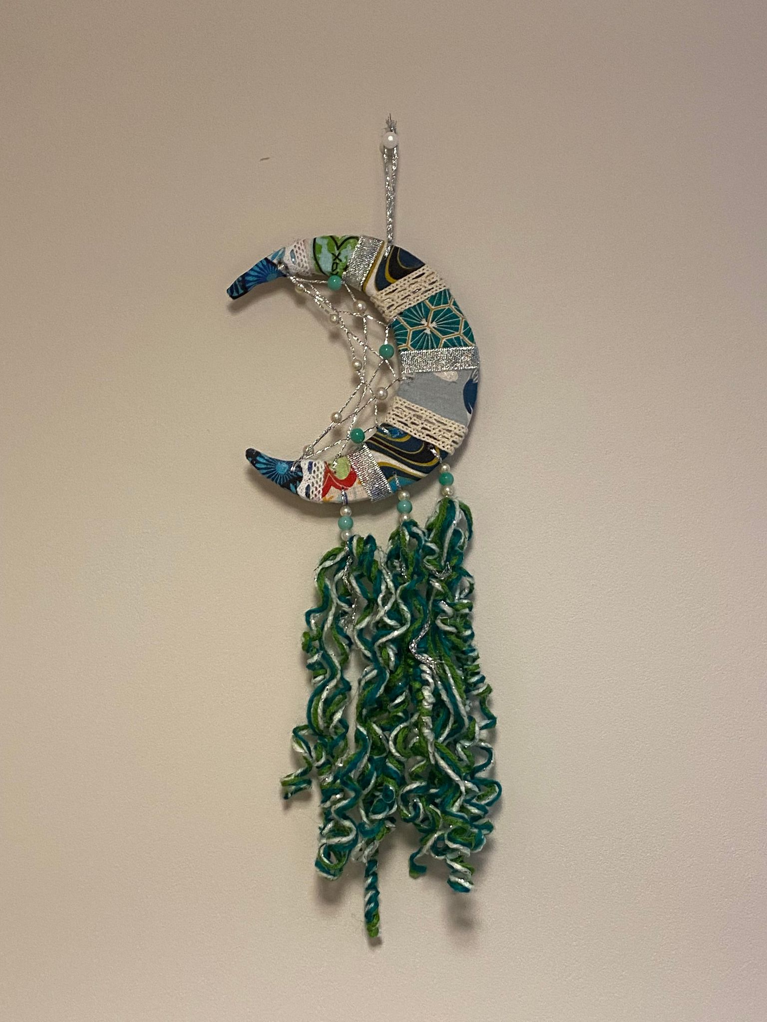 Magnifique attrape souhaits fait main sur support en bois , Décorer délicatement avec des tissus et des perles.